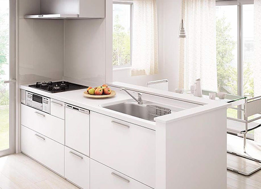 食器洗い乾燥機付き。たっぷり収納、出し入れスマートなソフトクローズ機構、汚れが溜まりにくく、汚れてもサッとひとふきで綺麗になるスキマレスシンク。毎日のお料理やお片付けを快適になる工夫がいっぱいです。お客様のお好きな色をお選びください。 |