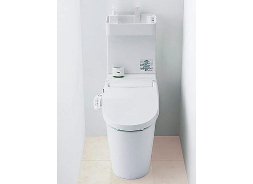 フォルムが美しい、温水洗浄便座。リモコンで便器洗浄ができるスグレモノ。継ぎ目や凸凹が少ない形状で、汚れはサッとひとふき。手洗いボールはスゴピカ素材(有機ガラス系)。「水アカ」が固着しにくく、キレイが続きます。 |
