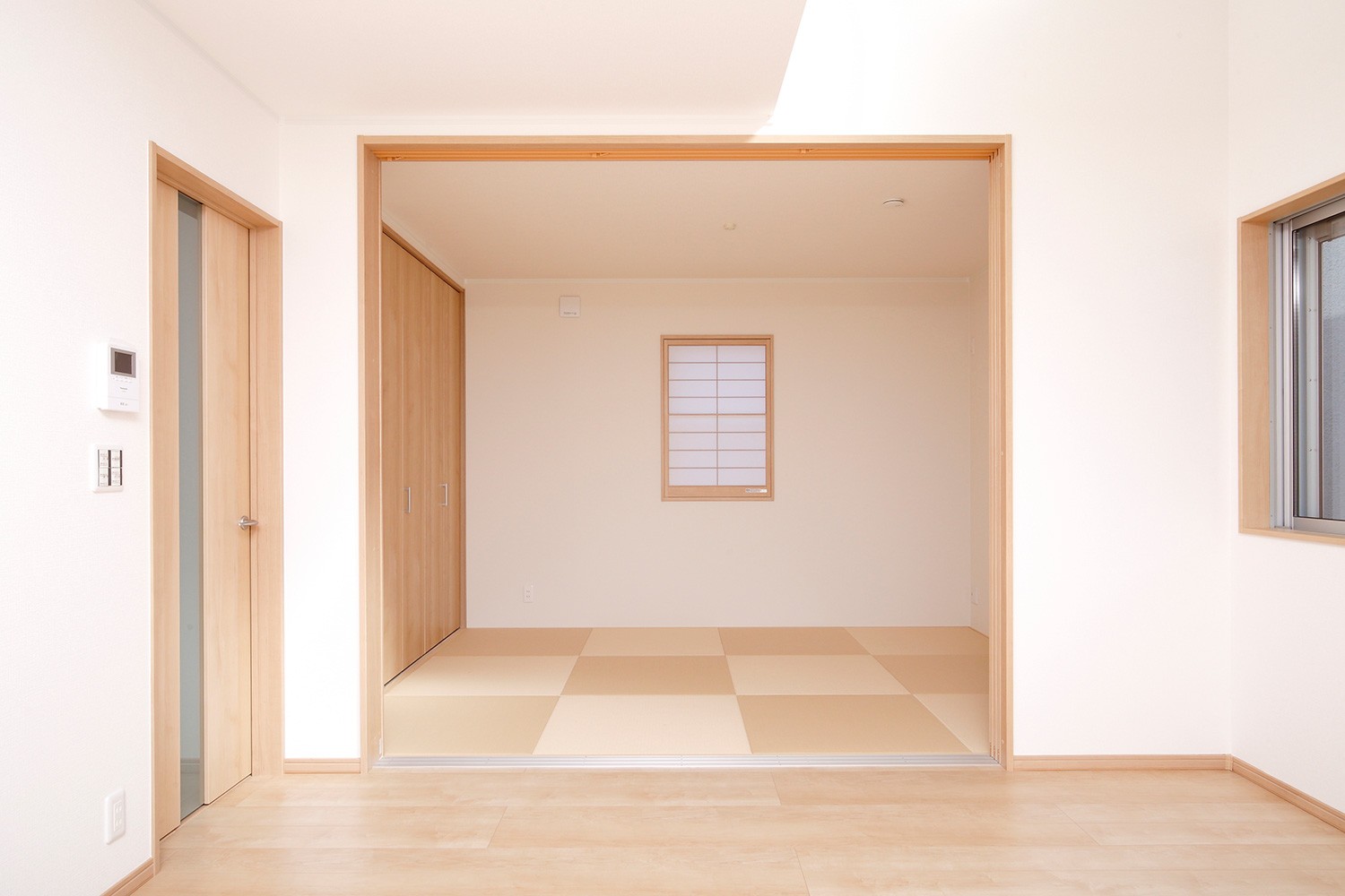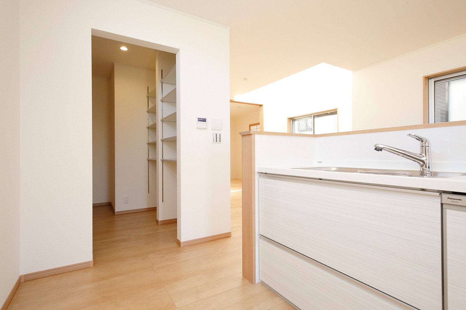 キッチンから洗面室につながるパントリーを設置。 玄関にはシューズクローク、大きな10畳の寝室にはウォークインクローゼットと収納たっぷりのお家になりました。